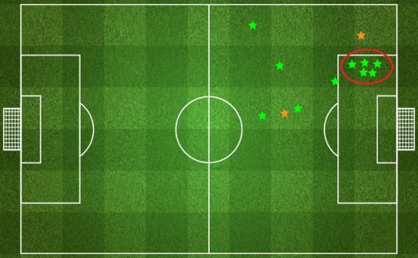 صورة توضح المراوغات التي قام بها براهيمي أمام تشيلسي ومنها 5 ناجحة داخل منطقة العمليات: