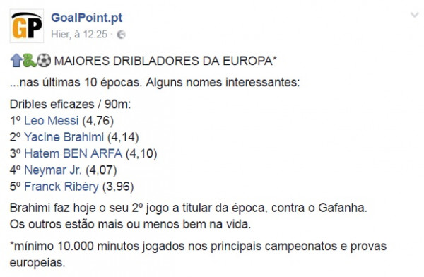 واحتل الدولي الجزائري ياسين براهيمي المرتبة الثانية خلف النجم الأرجنتيني ليونيل ميسي، حيث يمتلك نجم بورتو الحالي وغرناطة الأسبق مُعدل 4.14 مراوغة في كل 90 دقيقة، بينما وصل نجم برشلونة إلى معدل 4.76، فيما جاء حاتم بن عرفة في المرتبة الثالثة، يتبعه نايمار دا سيلفا والفرنسي فرانك ريبيري، واعتمد حسابات الموقع البرتغالي المتخصص على اللاعبين الذين شاركوا في أكثر من 10 آلاف دقيقة.
