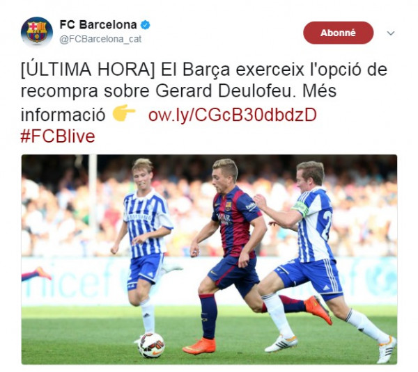 ويتعلق الأمر بالنجم الشاب جيرارد ديولوفيو، حيث قام النادي الكاتلوني بإستعادته من إيفرتون، وهذا من خلال تفعيل بند إعادة الشراء الموجود في عقده في صفقة كلفت حوالي 12 مليون أورو، وأضاف بيان النادي بأن عقد اللاعب ينتهي في 30 جوان 2019، و سيجلس الطرفان على طاولة المفاوضات عند نهاية الموسم المقبل وهذا أجل تمديد العقد، يذكر أن ديولوفيو كان قد لعب الموسم الماضي لميلان الإيطالي معار من إيفرتون، أين قدم مستوى مميز قاد فيه "الروسونيري" لحجز مقعد أوروبي في مسابقة الدوري الأوروبي.