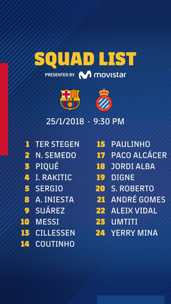 أعلن إرسنتو فالفيردي عن قائمة برشلونة التي ستواجه إسبانيول غدا لحساب إياب ربع نهائي كأس ملك إسبانيا، والتي شهدت تواجد الثلاثي كوتينيو، إنييستا وألكاسير بعد تلقيهم التصريح الطبي، فيما سيغيب كل من ديمبيلي وفيرمايلين للإصابة، وديولوفيو ودينيس سواريز بقرار فني من المدرب الإسباني.