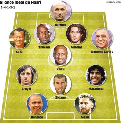 فابيان بارتيز، كافو، ليليان تورام، باولو مالديني، روبيرتو كارلوس، باتريك فييرا، زين الدين زيدان، يوهان كرويف، دييغو مارادونا، ليونيل ميسي، رونالدو "الظهارة البرازيلي".