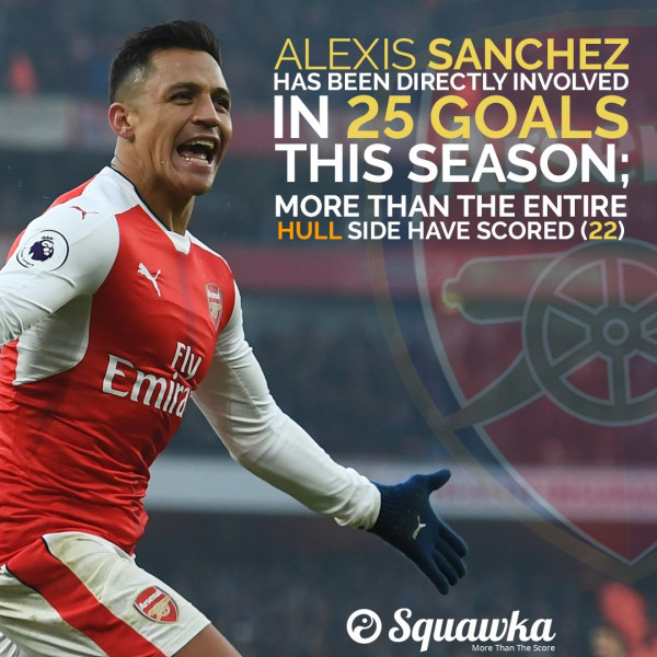 قاد أليكسيس سانشيز أرسنال إلى الفوز على هال سيتي بعدما سجل ثنائية فريقه في هذه المباراة، وبفضلها أصبح المهاجم الشيلي يحتل صدارة الهدافين في الدوري الإنجليزي الممتاز برصيد 17 هدفا، كما أنه ساهم في تسجيل 25 هدفا هذا الموسم في البريمرليغ وهو رقم لم يصل إليه منافس اليوم هال سيتي والذي ساهم جميع لاعبيه في تسجيل 22 هدفا هذا الموسم.