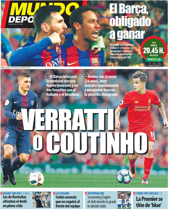 كشفت صحيفة "موندو ديبورتيفو" الكتالونية أن إدارة نادي برشلونة تحضر جديا لعقد صفقة خيالية لتعزيز خط وسط الفريق، وأضافت ذات الصحيفة أن إدارة "البارصا" تفاضل بين كل من ماركو فيراتي نجم باريس سان جيرمان وفيليبي كوتينيو المتلالق في صفوف ليفربول، حيث ستوجه أنظارها نحو أحدهما الصيف القادم على أمل ضمه من أجل تعزيز قوة الفريق تمهيدا للموسم الجديد.