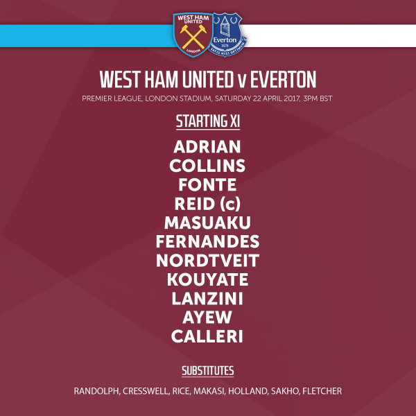 يستصيف ويست هام نادي إيفرتون ضمن إطار الجولة 34 من الدوري الإنجليزي الممتاز، وأعلن مدرب "المطارق" الكرواتي سلافين بيليتش عن التشكيلة التي سيدخل بها هذه المواجهة، والتي عرفت عدم تواجد إسم الدولي الجزائري سفيان فغولي سواء في التشكيلة الأساسية أو على دكة البدلاء.