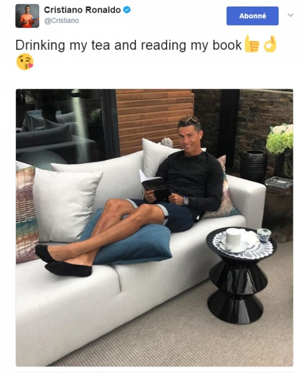 يسعى كريستيانو رونالدو إلى إخراج نفسه من الضغوطات قبل أيام عن نهائي دوري أبطال أوروبا، والذي سيجمع فريقه ريال مدريد بجوفنتوس، أين نشر الدولي البرتغالي صورة عبر حسابه الرسمي على تويتر، وهو بصدد قراءة كتاب، حيث علق على الصورة بـ: "أشرب الشاي و أقرأ كتابي".
